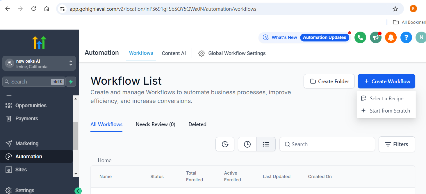 Open GoHighLevel website in your browser and login with your account credentials, on the left panel, click “Automation” Tab.